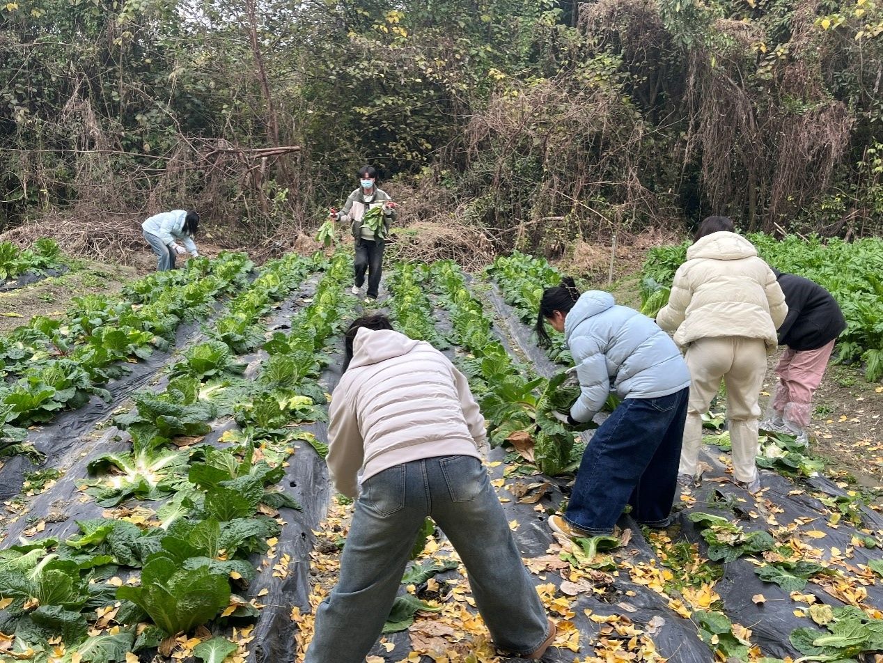 “耕读田园”第二课堂的学生在“南野”开展集中采摘活动,并在“SWUFE 劳动集市”设立展销摊位,将亲手种植的新鲜白菜推向校园市场。